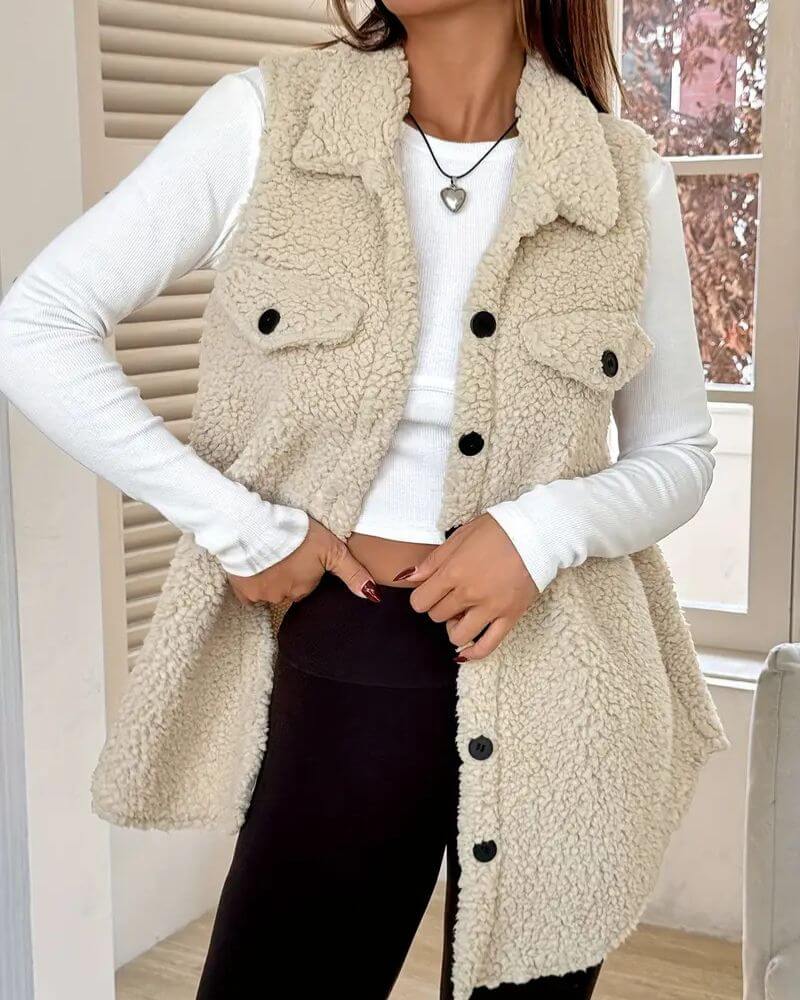 Dieser lange, ärmellose Teddy-Mantel schenkt dir Komfort in den Momenten, in denen eine normale Schicht einfach nicht reicht. Das weiche Gefühl und der bequeme Schnitt machen ihn zum perfekten Begleiter, um dich warm zu halten, ohne schwer oder einengend zu wirken. Einfach, gemütlich und ideal für jeden Tag gemacht.